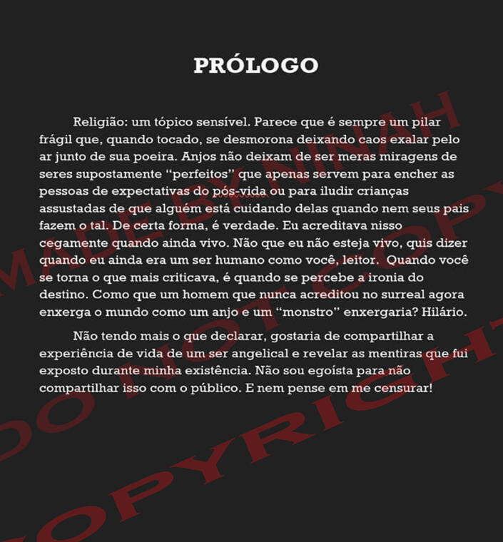 Este é um projeto em andamento de um livro independente que conta sobre a história da vida de um anjo nos olhos de uma pessoa negra.Sinopse: "Minha vida é uma mentira!" é o que muitos dizem por aí. Angelo experienciou isso do modo literal. Agora no pós-vida, o mesmo reflete sobre a sociedade em que vivia e sobre seus problemas, percebendo o quão pequenos eram para que todos os ignorassem"EM BREVE MAIS ATUALIZAÇÕES